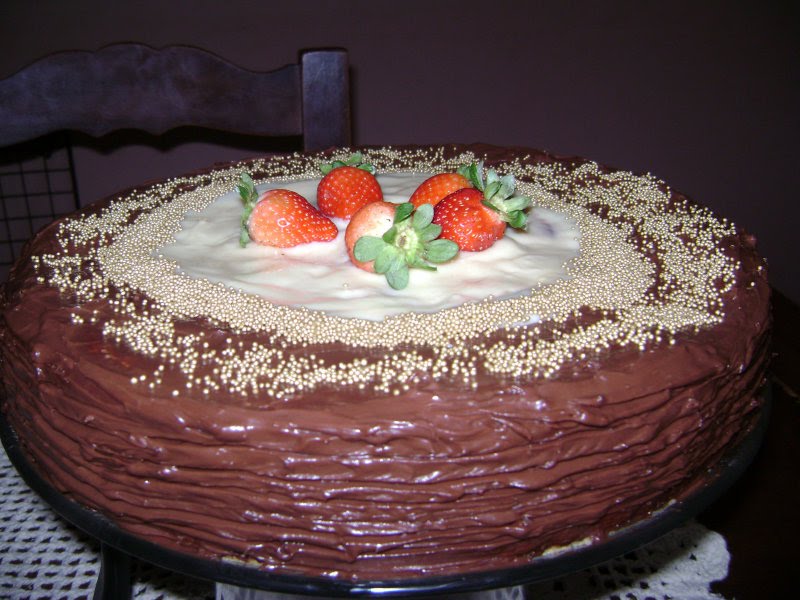 Essa massa, que foi retirada, rasgue-a em pedaços pequenos e misture com o chantilly e os morangos cortados grosseiramente. Envolva bem delicadamente, pra não virar uma maçaroca. Recoloque esse creme (massa e morangos picados com o chantilly) dentro da casca que ficou do bolo e ponha pra gelar por uma ou duas horas. Prepare o ganache de chocolate meio amargo e espalhe por cima, alisando com uma faquinha. Bote pra gelar, novamente. Após endurecer a primeira cobertura, espalhe o ganache de chocolate branco sobre o meio amargo. Depois é só enfeitar. Deixe na geladeira de um dia pro outro e depois é só correr pro abraço.