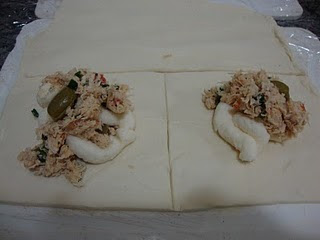 Deixa a massa descongelar para desenrolar sem quebrar. Coloque catupiry, frango e azeitona. Feche as pontas, nem precisa de água. Acomode no tabuleiro forrado de papel alumínio. Pincele com gema e parmesão. Leve ao freezer para gelar bem por uns 20 minutos.