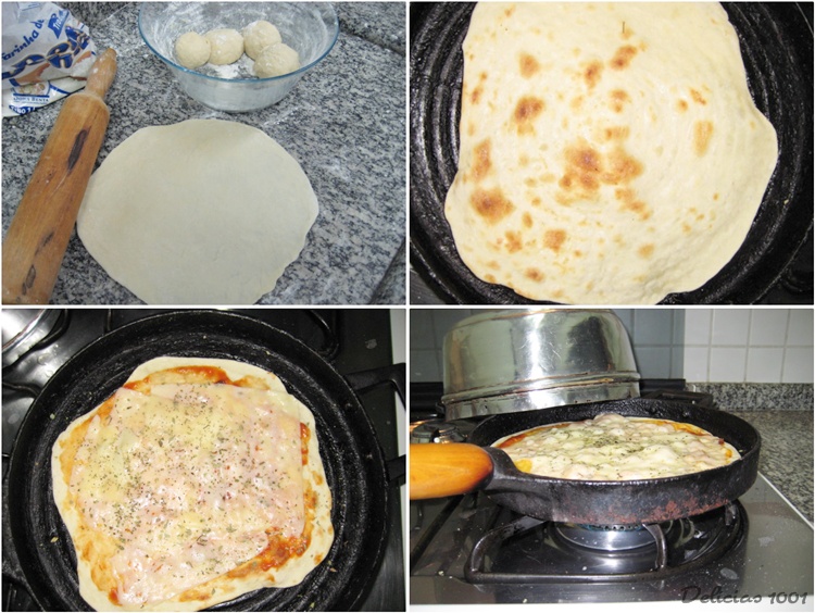 Coloca um fio de óleo na panela de fundo grosso (ou uma frigideira, ou uma panela de pressão, ou uma chapa) e põe um disco de massa aberto para assar.