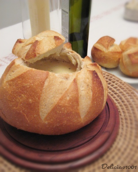 Coma com pedaços do pão mergulhados no queijo derretido.