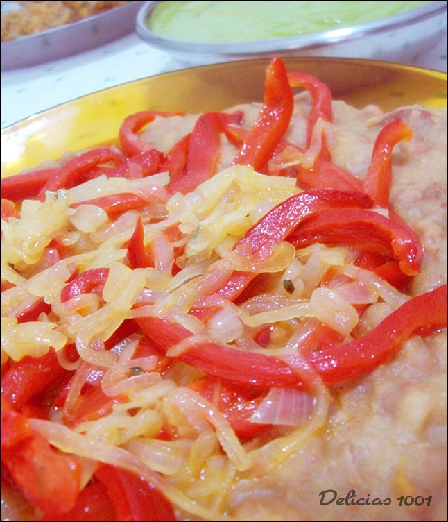 Em separado, refogo numa outra panela em um pouquinho de óleo cebola em rodelas bem fininhas, 1 pimentão vermelho em fatias e sal. Depois de macio, adiciono 1 pimenta de cheiro (sem as sementes) e cheiro verde. Aprendi com a tia Dirce…quando ela faz são só elogios !