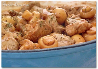 Aqui foi coisa rápida: cortei e temperei os filés com vinho branco, ervas finas, alho, pimenta branca e azeite e deixei marinar por 24 horas. Refoguei uma cebola no azeite até quase dissolver, somei a carne e deixei dourar. Acrescentei um vidro pequeno de champignons (drenado), 1 colher (sobremesa) de extrato de tomate, 1 colher (sopa) de mostarda, 2 colheres (sopa) de molho de soja (shoyu) e 100ml de água. Quando a água reduziu pela metade, polvilhei por cima 1 colher de sopa de amido de milho e misture bem. Juntei mais um pouco de água e deixe ferver até a consistência que eu queria. Salpiquei umas ervinhas por cima e um pouco mais de pimenta. Booom que só!