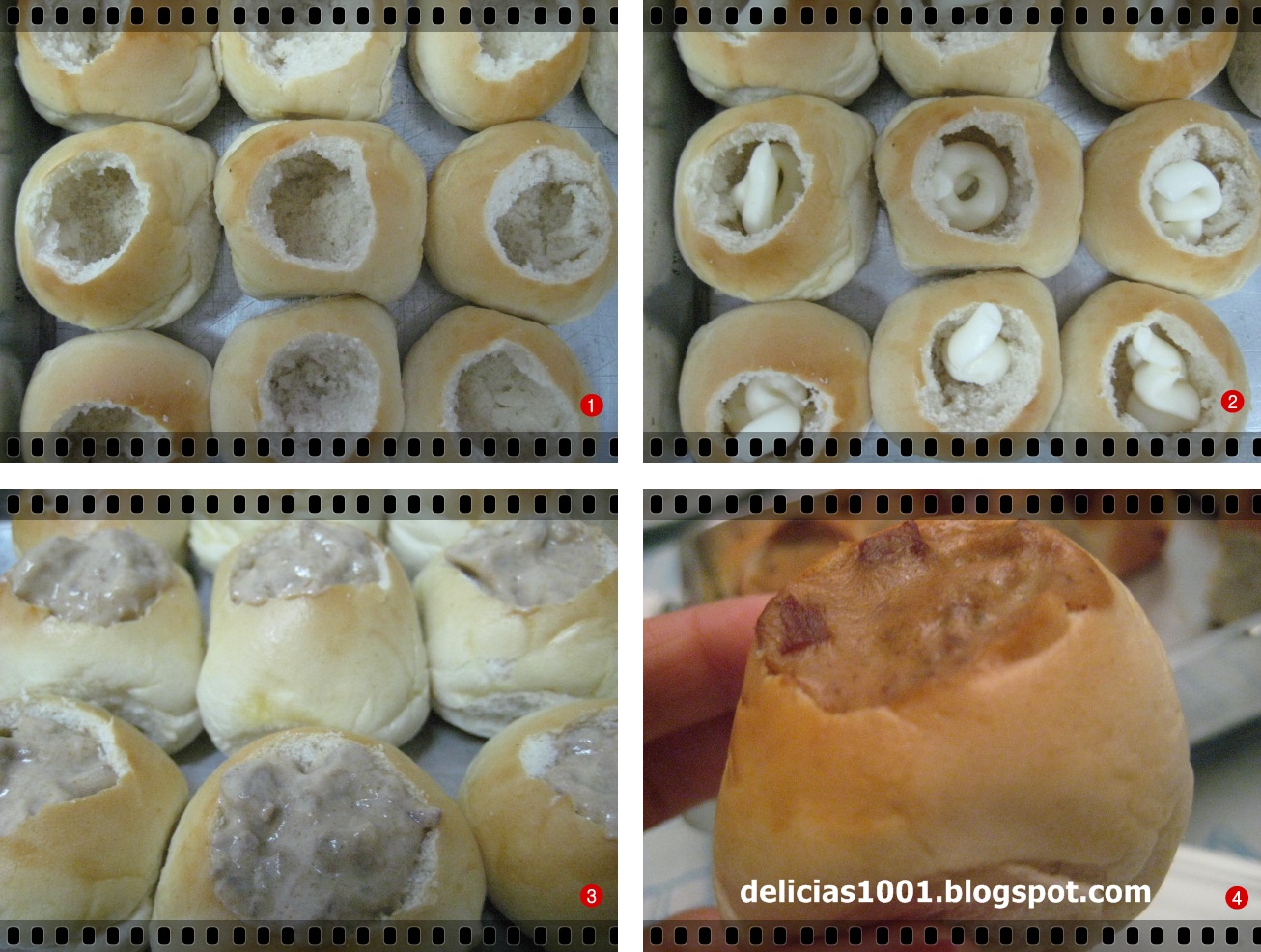 Você pode fazer o pão de minuto ou comprar pronto. Fure no centro e retire o miolo com uma colherzinha. Depois coloque um pouco de requeijão cremoso (eu usei aquele em bisnaga) ou o catupiry. Complete com strogonoff e leve ao forno para esquentar.