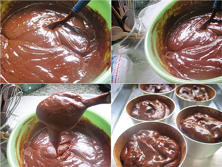 • Unte forminhas pequenas, próprias para petit gâteau, com manteiga (eu polvilhei com chocolate em pó para o petit gâteau não ficar manchado com trigo);