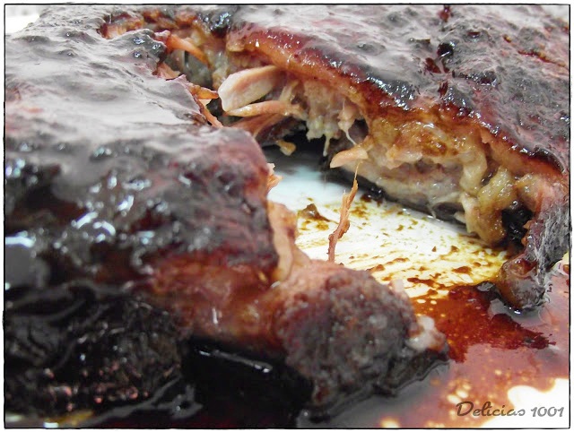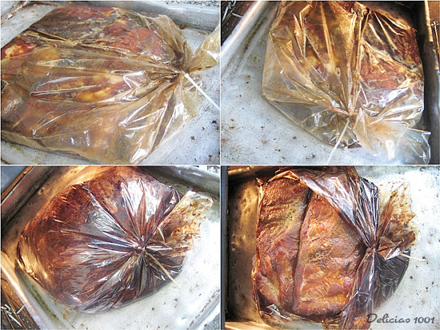 No dia seguinte, virei a costela (osso para baixo, fiz uns furos na parte superior do saco) e levei ao forno pré-aquecido à 200ºC e deixei por 2 horas. Então, cortei o saco por cima, cobri a costela com um pouco do molho que se formou dentro do saco e deixei dourar por mais 15 minutos. Isso faz com que o molho engrosse e fique mais encorpado. Para servir, reguei novamente com o molho (tipo barbecue).
