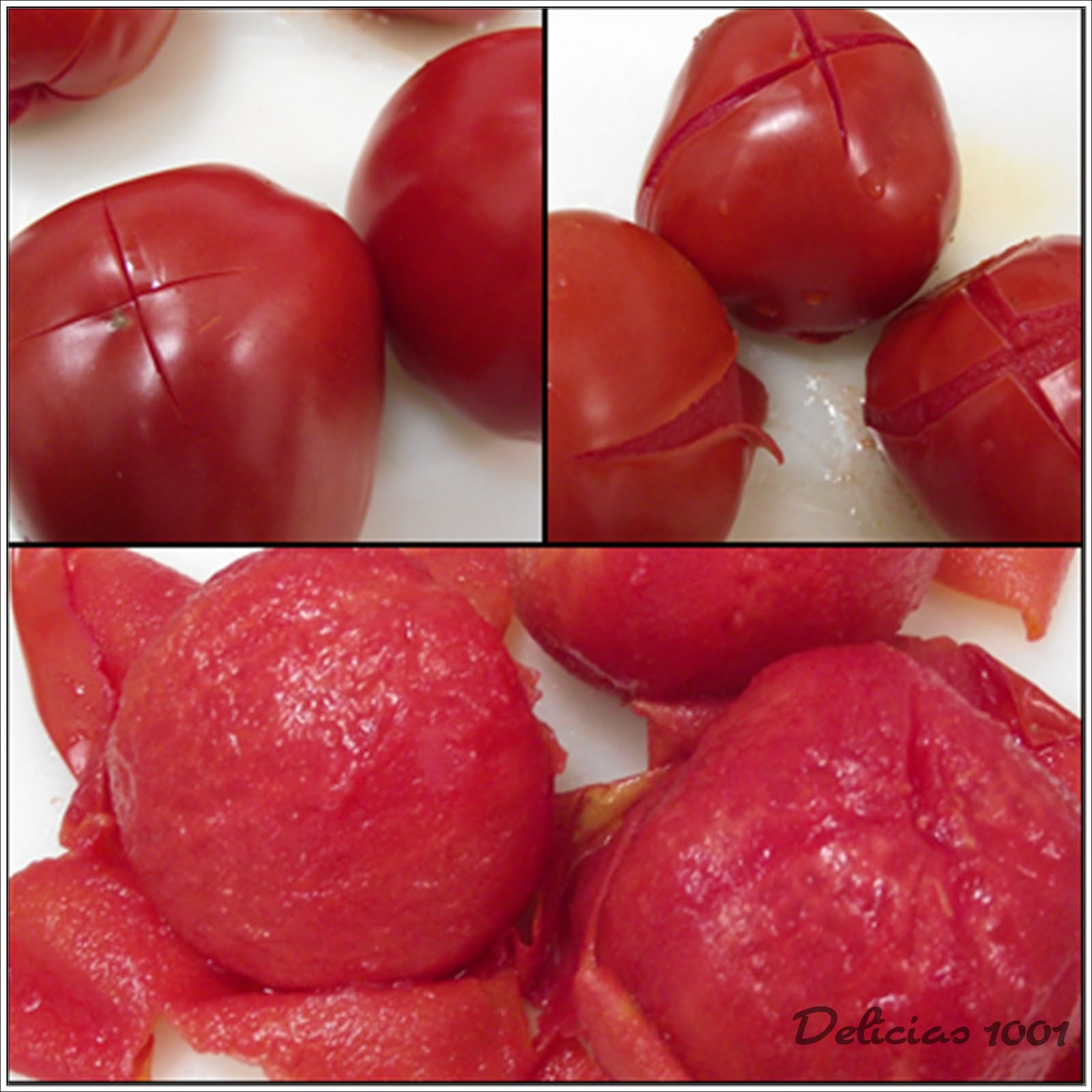 Peguei alguns tomates bem maduros, fiz uma cruz com uma faca afiada no ‘bumbum’ de cada um e coloquei numa panela com água fervente por 1 minutinho, tempo suficiente para a pele se soltar.