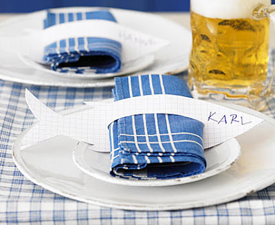 É um simples pedaço de papel no formato de um peixe. No meio, corte um buraco oval por onde o guardanapo dobrado é colocado. (Mais abaixo o molde dos peixes em dois tamanhos)