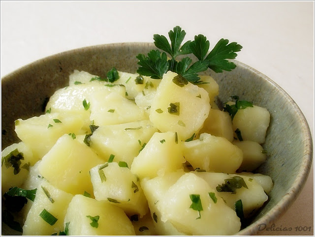 Corte as batatas em cubinhos e cozinhe em água salgada. Quando estiverem cozidas, escorra toda a água, usando a tampa da panela para segurar os cubinhos dentro. Não abra a panela, não deixe o vapor escapar de dentro.