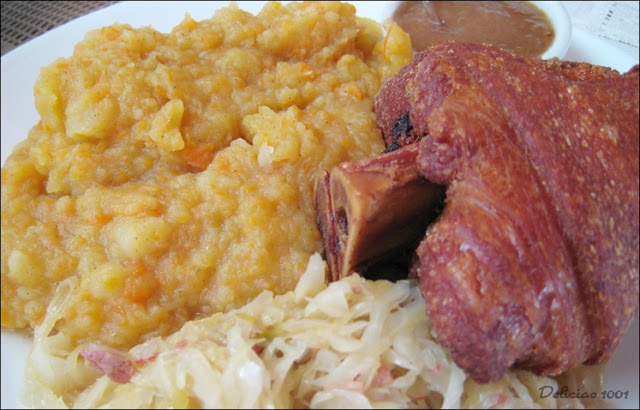 Provei pela primeira vez e devo confessar que é bom, mas esperava mais. Quase não tem carne, só pele e osso! Como acompanhamento, chucrute, purê de batata e cenoura e creme de maçã.