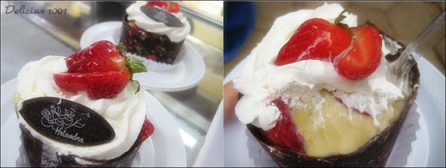 Vou tentar explicar: uma fatia de pão-de-ló na base, com um creme delicioso tipo ‘confeiteiro’ por cima, morangos e chantilly, tudo isso envolvido por uma casquinha de chocolate decorado.