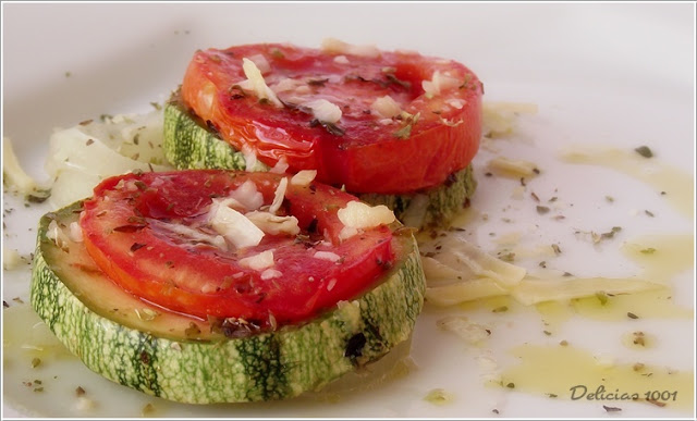 Forrei uma travessa untada com rodelas grossas de cebola, de abobrinha e de tomates. Entre uma camada e outra, salzinho (bem pouquinho) e orégano.