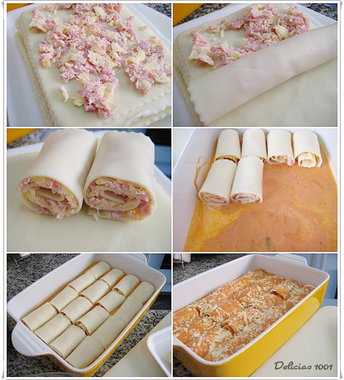 Comprei a massa (para lasanha) pronta e recheei com 250g de mussarela ralada, 250g de presunto ralado e 3 colheres de catupiry para dar liga.
