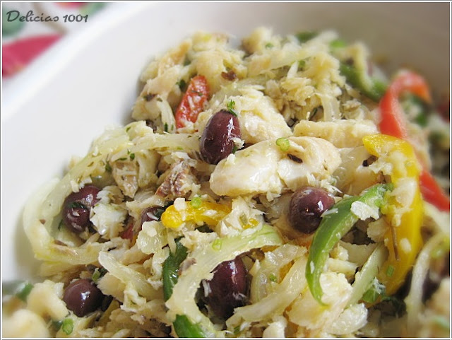 Desfie grosseiramente, misture com pimentão vermelho, verde e amarelo, cebola, tomate seco, tudo em fatias. Muito cheiro verde, azeitonas pretas, pimenta do reino e azeite.