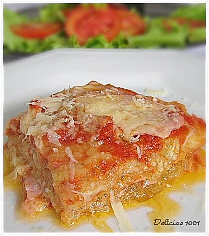 Para montar, coloquei numa travessa refratária em camadas molho, berinjela, muçarela e presunto, finalizando com molho e parmezão ralado.