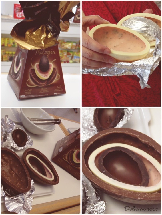 Este é o trilogia. Na verdade trata-se de 3 ovos, um dentro do outro, dando a oportunidade para curtir diferentes sabores ao mesmo tempo. Um ovo maior é com chocolate ao leite com recheio de avelã, o do meio é branco com recheio de frutas vermelhas e o menorzinho ‘dark’ com recheio de chocolate ao leite. Abrir cada um é uma emoção só… saborear, então, sem palavras.