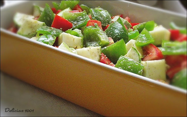 Corto em cubos 1 pimentão verde, 2 berinjelas inteiras, 2 abobrinhas pequenas e 2 tomates. As quantidades podem variar, de acordo com sua preferência.