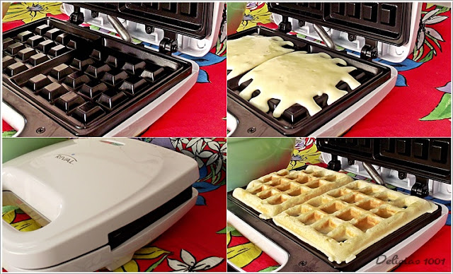 Coloco 1 concha de massa na máquina de waffle, fecho, conto 2 minutos e sirvo.