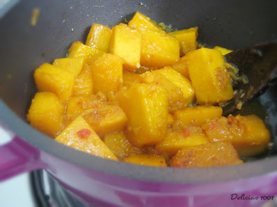 Refoguei 1/2 kg de abóbora madura em cubos,1 pitadinha de açúcar e um pedacinho de pimenta dedo-de-moça bem picadinho por 5 minutos, até começar a cozinhar.
