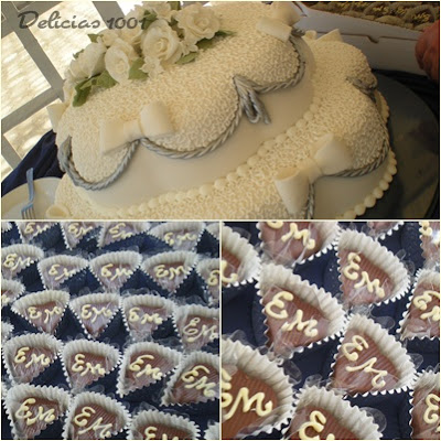 E, para fechar, um lindíssimo (e delicioso) bolo, docinhos e bombons com as iniciais dos ‘noivos’.