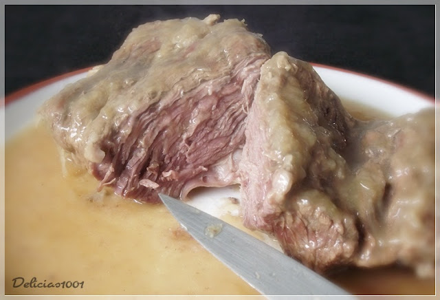 Após este tempo, abro a panela e vejo com um garfo a textura da carne. Caso ainda esteja dura, deixo na pressão por mais uns 10 minutos.