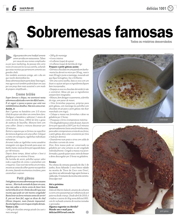 Desta vez, no Jornal do Meio, publiquei sobremesas famosas, com jeitão de difíceis e cheias de lero-lero, que, na verdade, qualquer pessoa comum e normal (assim como eu!) pode preparar.