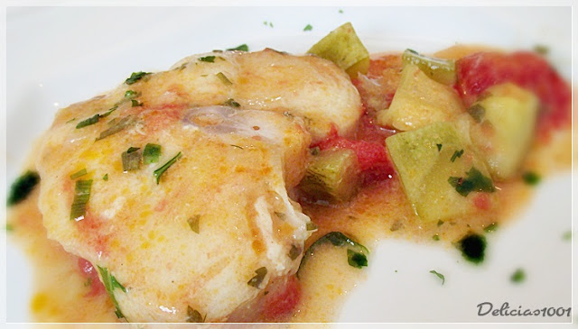 Numa panela média, coloquei óleo com 1 cebola ralada, 1 abobrinha em cubinhos e 1 tomate sem pele picado. Refoguei rapidamente e acrescentei o peixe, deixando cozinhar com a panela semitampada por 5 minutos.Virei as postas com cuidado e reguei com ½ xícara de água e ½ xícara de leite e 1 colher (sobremesa) de amido de milho. Mais 10 minutos em fogo baixo e o peixe ficou bem macio.