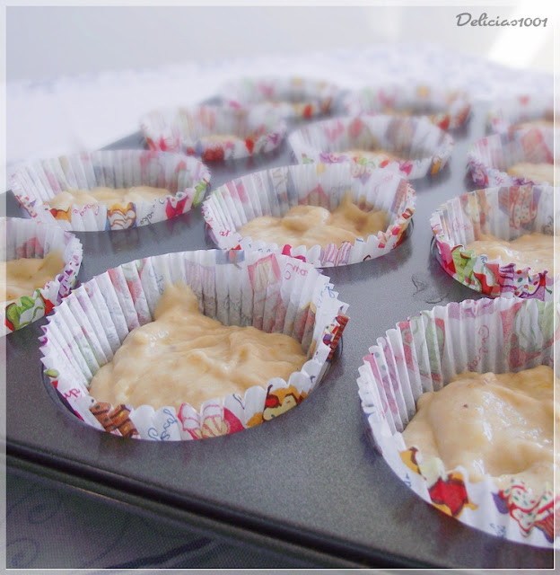 Acomodei as forminhas de papel para cake numa forma com buracos (mas poderia ser em forminhas de empadas). Coloquei 2 colheres de massa dentro de cada uma. Levei ao forno pré-aquecido (médio -180ºC) por 25 minutos ou até que dourassem.