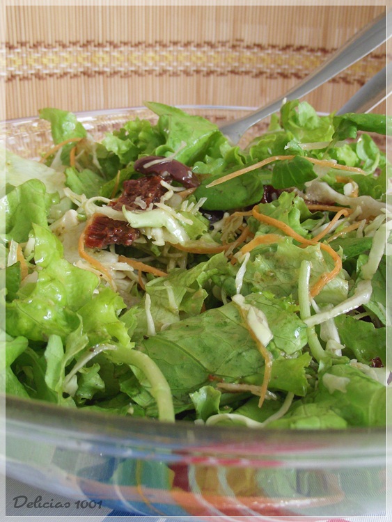 Eu estava com pressa, como sempre. E não queria perder tempo lavando alface, escolhendo rúcula, ralando cenoura. No supermercado resolvi facilmente comprando um pacote de verduras para salada já escolhidas e lavadas. Tinha alface fresca e lisa, rúcula em pétalas, cenoura. Para incrementar, acrescentei tomate seco fatiado, azeitonas pretas sem caroço picadas, alcaparras, queijo parmesão ralado… era o que eu tinha em casa.