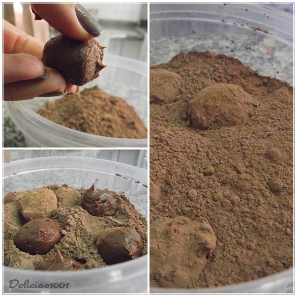 Mergulhei em um pote com chocolate em pó (com 50% de cacau) e afundei todas as trufas.