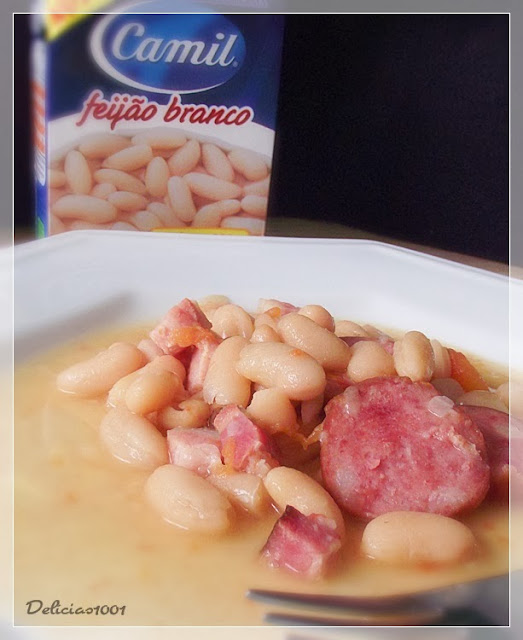 Comecei aquecendo um fio de óleo na panela e acrescentando 100g de bacon grosseiramente picado, até dourar. Juntei 1/2 cebola bem picadinha, 2 dentes de alho amassados e, então, 1 gomo de paio sem sua pela cortado em rodelas. Acrescentei também 1 cenoura em rodelas e 1/2 xícara de água. Acertei o sal e deixei cozinhar bem, com a panela tampada, em fogo baixo. Adicionei 1 embalagem do feijão branco pronto Camil com seu líquido e continuei o cozimento para pegar bem os sabores.