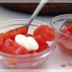 Enquanto isso, numa panela grande, coloquei 1 litro de água, 800g de açúcar cristal e 5 cravos. Fervi essa calda ainda bem mole e joguei os cubos de mamão dentro, deixando que cozinhassem bem. Quando espetei um garfo dentro e ele saiu bem, retirei o mamão da calda e acomodei numa tigela alta. Deixei a calda no fogo ainda para engrossar um pouco mais. Despejei sobre o mamão e esperei gelar para servir com uma colherada de requeijão cremoso.